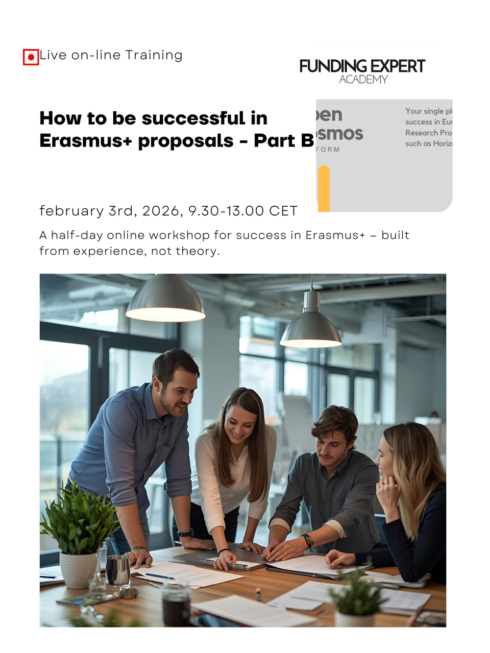 This live workshop transforms the knowledge from Part 1: The Recipe 4 Success in Erasmus+ into direct practice.